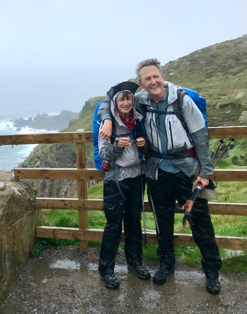 If retirement adventures are meant to pile up memorable moments, then this is one. Indeed. We stood at the end—Land’s End, that is—of our backpacking trip on England’s South West Coast Path. Soaked to the skin, we had battled horizontal rain all afternoon, but were, as they say, all smiles, even giddy.