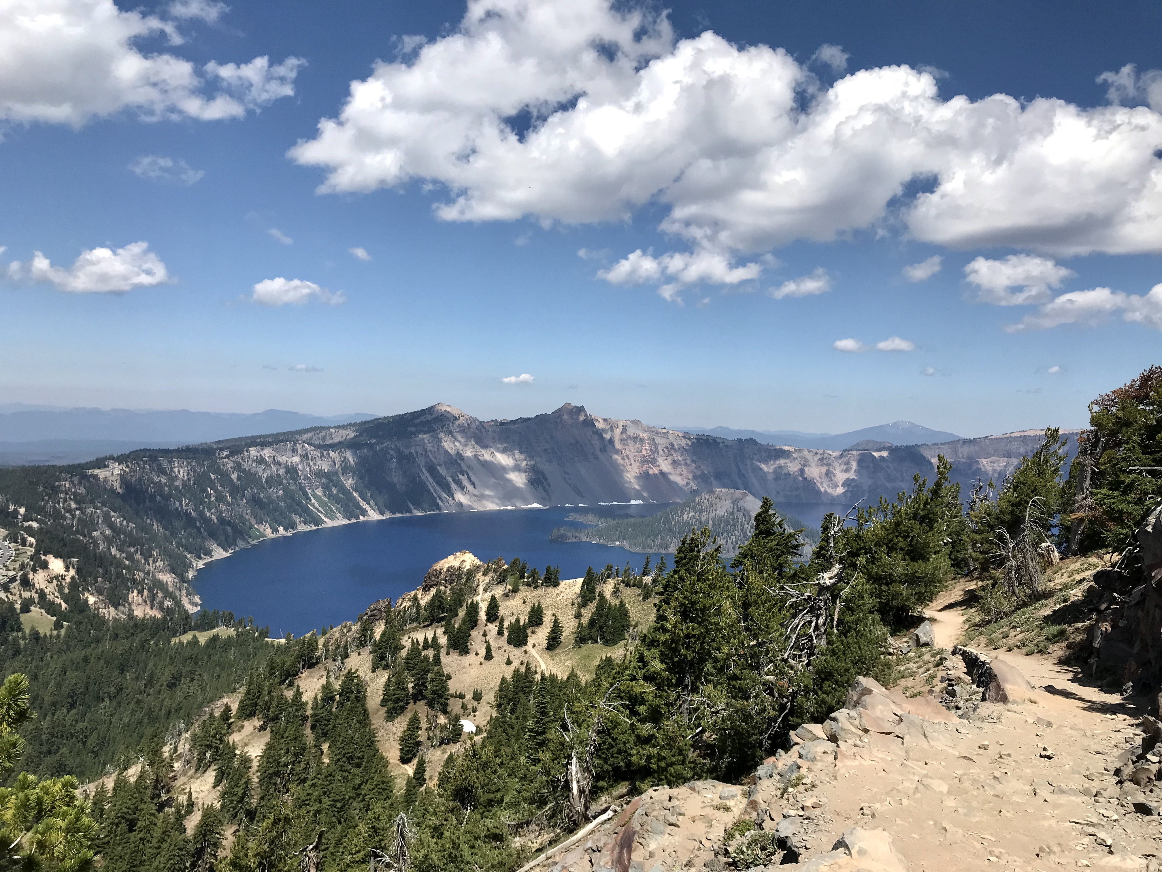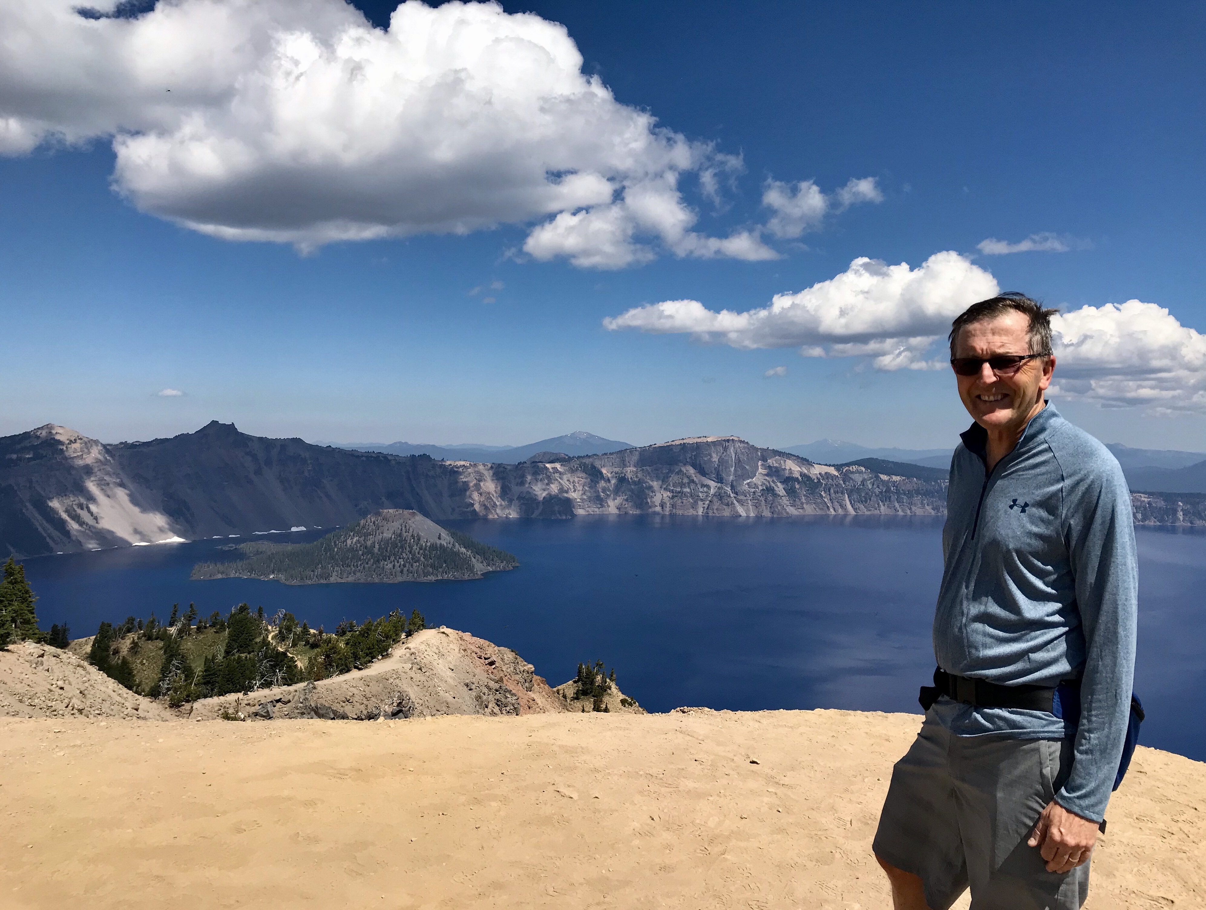 Crater Lake provided the backdrop on the first day of August for our hike to Garfield Peak, a stone’s throw above 8,000 feet and 2,000 feet higher than the surface of the deepest fresh water lake in the USA. Sue and I found the altitude a bit challenging for our lungs at first, but after a stop for snacks, made it to the top in less than an hour. We are fortunate that our home in Ashland, Oregon, is just a two-hour drive from the national park.
