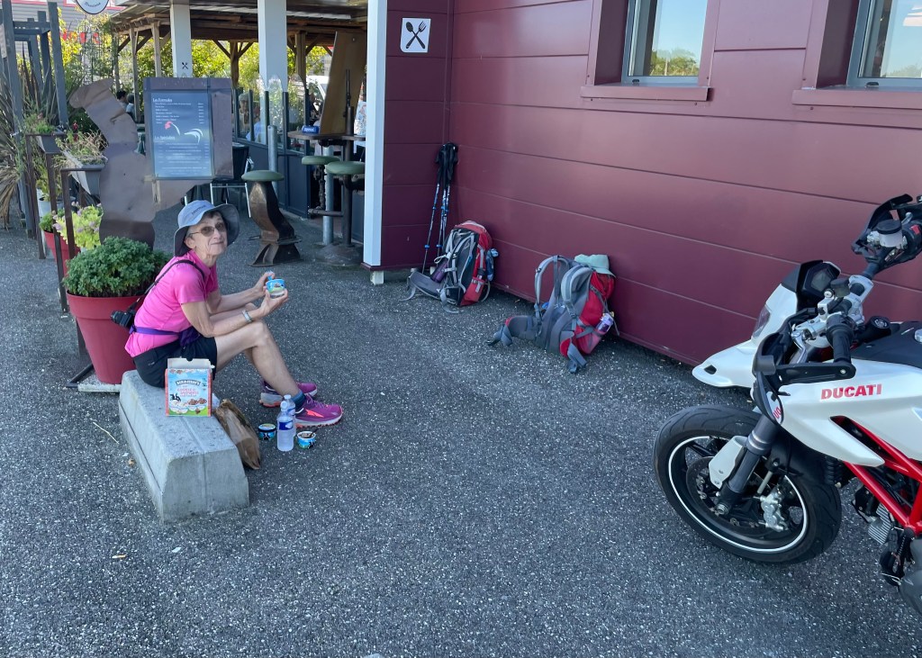 What to do today after a toasty day on the French Camino? We found shade and a curb where we shared a four-pack of Ben and Jerry’s ice cream (cookie dough and double chocolate fudge). We were tempted to ask the motorcyclists for rides to our hotel.