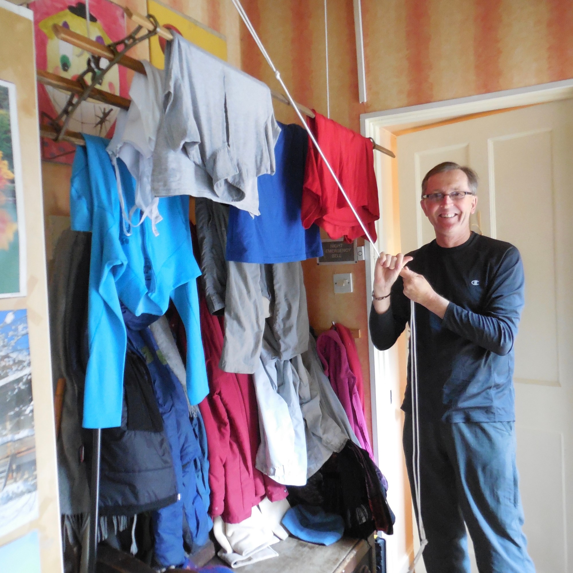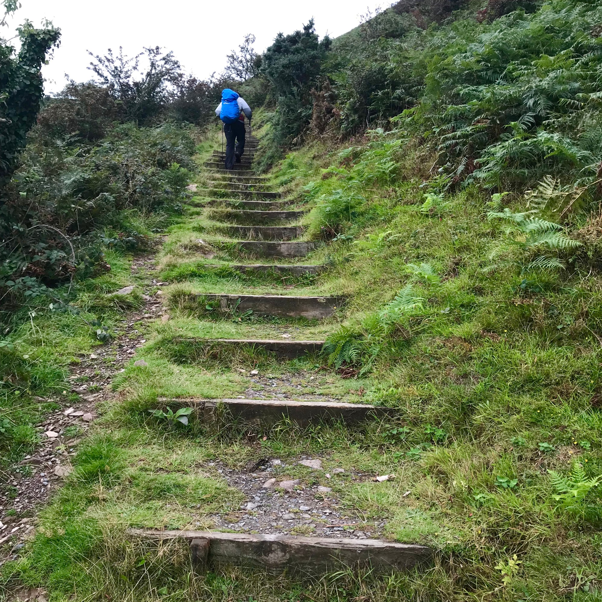 The Camino Frances inspired Sue and me to backpack four more European distance treks, each with a unique personality. A closed sign greeted us at an ancient aqueduct as we left Spoleto, Italy on the Way of St. Francis in 2018. Part of the official path, the aqueduct was closed after a 2016 earthquake, forcing us to turn around and walk a lengthy detour. How many stairs are there on England’s South West Coast Path? We climbed and descended many of the 30,000 steps in 2019. Glaciers on the Mont Blanc massif frame our favorite accommodation on the Tour du Mont Blanc, Rifugio Elisabetta, in 2016. An ingenious drying rack was a godsend at the Lander Bed and Breakfast in Drymen on the West Highland Way in 2014. Our adventures on the four treks are featured in my second book, Trippin’ Through My 60s.